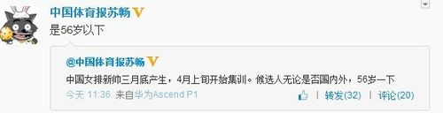 另外,中国体育报记者苏畅在微博上透露了一个选帅的细节,“中国女排新帅三月底产生,4月上旬开始集训。候选人无论是否国内外,56岁以下。”苏畅透露的这一年龄限制也引起了网友的猜测,因为1957年出生的陈忠和正好56岁,这位金牌主帅也一直是女排主帅热门人选。