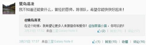 之后,前女排国手王子凌(“鹭岛清凌”)在微博上为“加菲猫小猫”打气,“在这个时候,我希望让更多人来鼓励你和爱你!@加菲猫小猫 ,你可以的!”随后她又写道“我不知道还能做什么,曾经的恩师,陈领队,希望你能快快好起来!”
