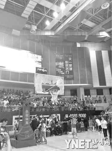 全运会男篮预赛翟小川"闯祸" 热身扣碎篮板(图)