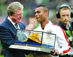 赛前,英格兰主帅霍奇森(左)和英足总主席伯恩斯坦为阿什利·科尔(右)颁发了国家队百场校帽。