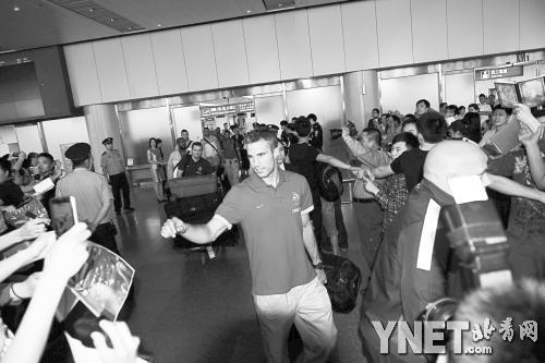 也许是老天爷也看到了球迷们的这片痴情,荷兰队乘坐的航班不仅没有晚点,还比规定时间早了将近一个小时降落在首都机场。等到8点半左右,取完全部行李的荷兰队出现在球迷们面前时,现场更是一片混乱。不过早已见过大场面的荷兰队队员们,也没有太多异样的表情,他们在现场安保人员的帮助下,冲过球迷们的围追堵截,坐上大巴车离开机场。