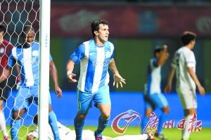 拉斐尔梅开二度,帮助广州富力获取两连胜。 本报记者 廖艺 摄