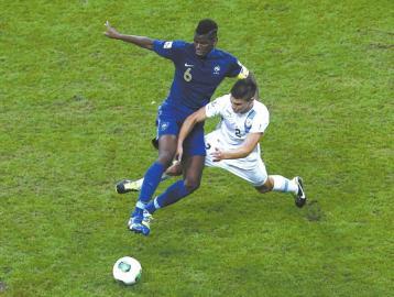 博格巴在决赛中与乌拉圭队员贴身肉搏。