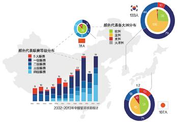 从2002年~2013年中国留洋球员的情况来看,人数明显呈增长趋势,但质量却下降明显。2002~2003赛季尽管只有9名球员留洋,但其中4人效力于欧洲5大联赛,包括孙继海、李铁、李玮峰和邵佳一。到了2008~2009赛季,尽管留洋人数多达18人,但只有邵佳一一人坚守德甲,其他球员都只能在低级别联赛混迹。2012~2013赛季,中国球员留洋人数多达31人,其中26人效力于欧洲联赛,但无一人在5大联赛立足,绝大多数在葡萄牙乙级甚至丙级联赛效力,在第4级别联赛踢球的球员更多达11人,占比35.5%。在亚洲其他联赛效力的中国球员仅一人,这个独苗就是在泰国孔敬FC效力的后卫李响。中国有4人在美洲效力,陈志钊尽管效力巴甲豪门科林蒂安,但他的出场次数寥寥无几。