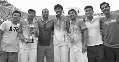 ■ 吴迪(左二)张之臻(左四)男双夺冠后与外教大卫(左三)何塞(右一)合影留念