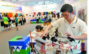某运动品牌的师傅给球拍穿线。 本报记者 廖艺 摄