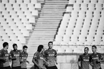 8月13日,葡萄牙队在里斯本进行训练,备战将于14日与荷兰队的足球友谊赛。这是葡萄牙队球员在进行训练。