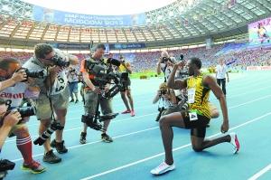 本报讯(记者 高炜)北京时间昨晚,牙买加短跑明星博尔特与队友在莫斯科田径世锦赛男子4×100米接力决赛中夺冠,博尔特也用这枚金牌为此次莫斯科之行画上一个圆满的句号。至此,博尔特在连续3届世锦赛上共夺得8金,追平了美国传奇巨星刘易斯保持的世锦赛8金纪录。
