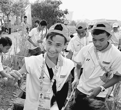 亚青赛组织体验活动 新加坡运动员抓到小龙虾