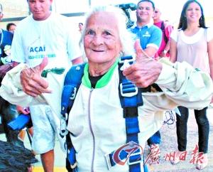 据俄罗斯《都市日报》报道,巴西一位103岁的老太太阿依达·门德斯日前成功从3000米的高度完成了一项高空跳伞运动,成为世界上年龄最大的跳伞者。据报道,这是门德斯在过百岁后的第三次跳伞。