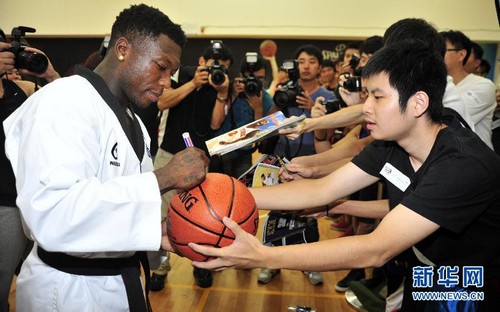 8月22日,曾凭借惊人弹跳力摘得3次扣篮大赛冠军的NBA丹佛掘金队球星内特·罗宾逊现身台北,来到跆拳道馆一展身手,并与现场球迷交流互动。