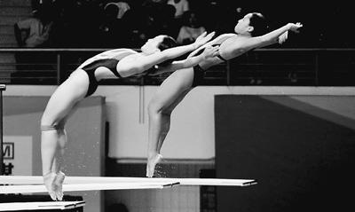 8月27日,河北选手张君/王涵在比赛中。当日,在十二运会跳水女子双人三米跳板决赛中,张君/王涵以总分344.10获得冠军,江苏选手屈琳/陈烨获得亚军,辽宁选手吴春婷/许智欢获得季军。