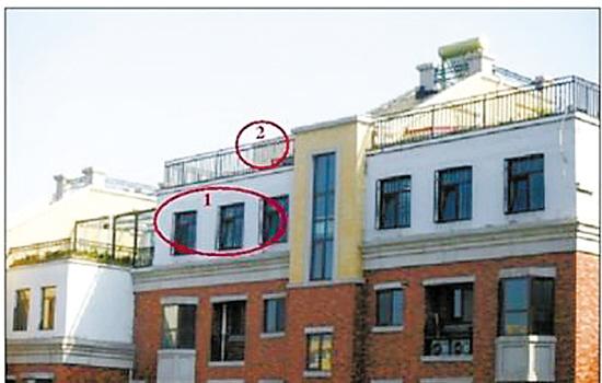 杨智家的楼顶上加盖了两层违建,其中北侧露台建成了一层灰白色的房屋(①)。在该违建顶部的东侧,又加盖了一层面积较小的房屋(②)