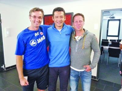 在青训营,杨晨还碰到了两位在法兰克福踢球时的老队友,法兰克福U17主帅宾德瓦尔德和U23(预备队)主帅舒尔,三位老队友重逢,激动地又抱又跳,开心得像孩子一样(上图)。据法兰克福俱乐部的官员介绍,现在俱乐部已经与上海的青少年培训机构进行了合作,进行了教练人员交流与培训,还开展了青少年足球夏令营等活动。如果可能,他们也很愿意为老朋友杨晨提供相关服务和技术支持。(记者 张昊)