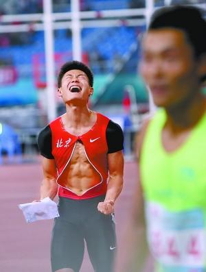 晚上的决赛,起跑占优的苏炳添几乎领跑了90米,张培萌在冲刺阶段完成超越。撞线后,张培萌抑制不住兴奋,撕开上衣,放声大吼,随后又绕场狂奔。
