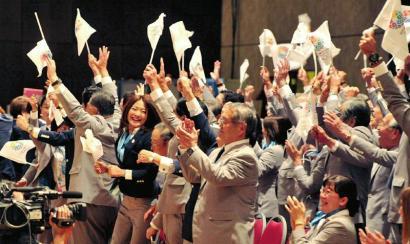 日本代表团为赢得2020年夏季奥运会举办权欢呼庆祝。