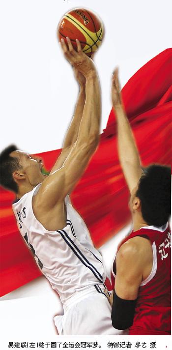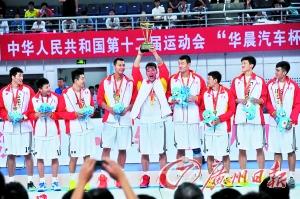 广东队将士在领奖台上欢快地举起了冠军奖杯。 特派记者 廖艺 摄