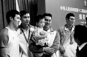 温暖 广东队游泳选手周嘉威(右一)在比赛结束后抱着儿子留影。 新华社记者 王鹏摄
