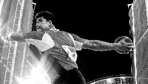 男子铁饼决赛新疆队努尔买买提·吐拉克的奋力一掷。 新华社记者廖宇杰摄