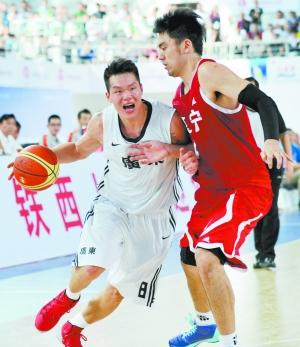 9月12日,在辽宁沈阳进行的第十二届全运会男子篮球成年组决赛中,广东队以69比63战胜辽宁队,夺得冠军。图为广东队球员朱芳雨(左)在比赛中运球突破。 新华社记者 岳月伟摄