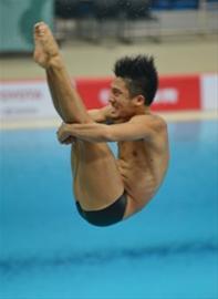10月7日,在第六届东亚运动会跳水比赛男子3米板比赛中,中国选手蔡程成以410.20分的成绩夺得季军。这是蔡程成在比赛中。