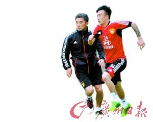 国足代理主帅傅博(黑衣)与球员在训练中。本报记者 廖艺 摄