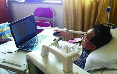 聂卫平躺在病床上看直播。