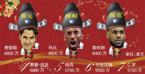 一家名为“欧美体育市场”的体育营销机构发布了2013年体坛明星广告收入榜,瑞士网球名将费德勒高居榜首,两位NBA巨星科比·布莱恩特和勒布朗·詹姆斯排在第2位和第3位。