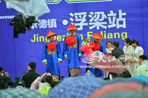 本届环鄱赛,浮梁结合不断深化的文化旅游,在颁奖环节继续“抢眼球”:冠亚季军依次坐上金黄顶、蓝顶、红顶代表状元、榜眼、探花的官轿,由官锣开道,在一众“衙役”高举“回避”、“肃静”牌,在一众“官兵”及“侍女”的左拥右簇下,威风八面地来到颁奖现场。其中状元轿是八抬大轿,榜眼和探花是四人抬的轿子。“非常意外,有特色,记忆深刻,下次还要来景德镇比赛。”浮梁站的冠军、蒙古国选手土诺康盖说。
