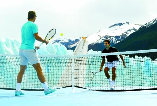 如今,辉煌的2013赛季已经过去,纳达尔与德约科维奇都在享受假期生活。近期,两人同时出现在阿根廷,参加网坛巨星纳尔班迪安的告别赛。当地旅游局自然不会放过如此好的宣传机会,特意出资打造“天王船上对抗”的表演:在阿根廷著名景点莫雷诺冰川附近的一条游船上开辟出一块“微型”网球场,纳达尔与德约科维奇隔网相对……