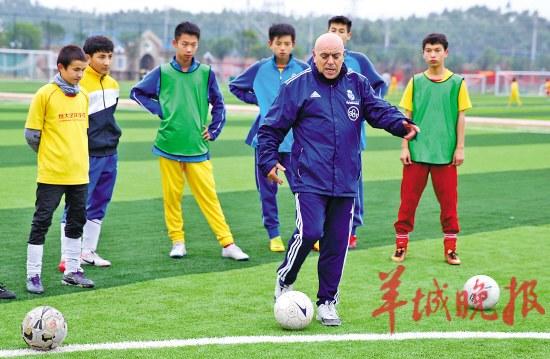 恒大皇马足校校长、广州恒大队主帅里皮(左前)为正在训练的小学员讲解技术