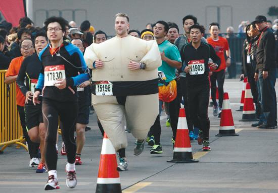 上海国际马拉松赛比赛中,一名扮成相扑运动员的选手在参赛。本组图片均据新华社