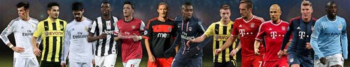 中场:罗本、里贝里、施魏因斯泰格(拜仁慕尼黑),京多安、罗伊斯(多特蒙德),波巴(尤文)、贝尔、伊斯科(皇家马德里)、厄齐尔(阿森纳)、亚亚-图雷(曼城)、马图伊迪(巴黎圣日耳曼)、马蒂奇(本菲卡)
