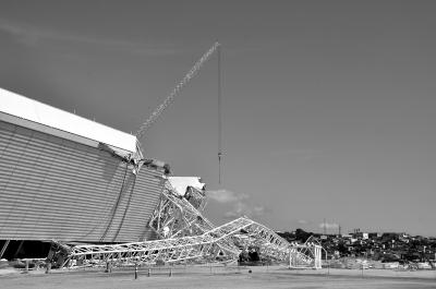 有意思的是,号称南美最大的城市圣保罗原本想做一个率先垂范的示例,提早揭开竣工的面纱,给国际足联和布拉特一点信心,结果却在我们从北京出发前一天搞砸了。接近竣工的工人们在拆除一个塔吊时意外发生了倒塌事故,导致死亡2人,伤3人。可见快节奏不是巴西人的特长,他们凡事喜欢慢生活。12日当我们驱车来到圣保罗世界杯体育场地外时,看到的景象仍与几天前出事时无异,倒在地上的塔吊仍在,被砸坏的建筑场仍然豁着一个大裂口,主人既没有把它遮挡起来,也没阻止我们的探访和拍照。