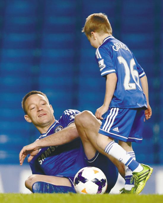 1月19日,在伦敦斯坦福桥球场举行的2013-2014赛季英格兰足球超级联赛第22轮比赛中,切尔西队主场以3比1战胜曼彻斯特联队。比赛结束后切尔西队球员特里与自己的一对儿女在球场一起玩踢球。