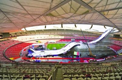 在鸟巢举行的滑雪比赛。