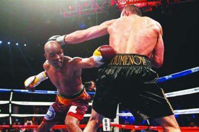 4月20日,在华盛顿举行的一场职业拳击比赛中,IBF轻量级拳王霍普金斯击败WBA轻量级拳王舒梅诺夫,赢得金腰带,并成为统一战最老拳王。这是霍普金斯(左)与舒梅诺夫在比赛中。