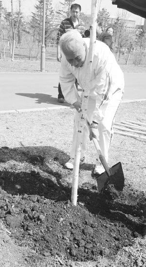 上图:王家骐院士正在给树苗培土。 丰雷 摄