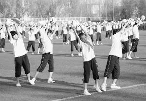 右图:28日,长春市实验中学学生在做足球操,他们或将在“未来之星”体育大会上代表我市进行体育展示。 王洪威 摄