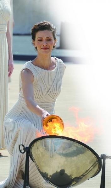最高女祭司点燃第一棒火炬手、希腊击剑运动员亚库马托斯手中的火炬。