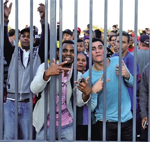 开幕式前一天,整个伊塔盖拉球场的周边就已经被球迷包围了。一些狂热的球迷,还撕烂了挂在防护网上的彩绘布,只为一窥球场内的点点滴滴。不少球迷集中在巴西队大巴进入球场的入口处,一起喊着他们熟悉的口号,为球队加油。
