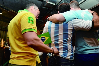 参与互动(0) 一名巴西球迷在两位阿根廷球迷合影之际悄悄将巴西国旗插在他们身上 摄/法制晚报记者 刘畅