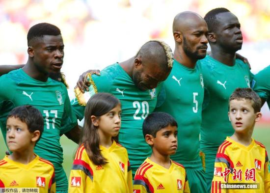 2014世界杯C组第二轮,哥伦比亚对阵科特迪瓦,首轮两队分别取胜,本场比赛取胜的一方将极有可能锁定小组第一。赛前唱国歌时,科特迪瓦球员迪耶泪流满面。