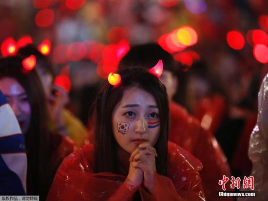 中新网6月23日电 在今天凌晨进行的一场世界杯小组赛中,韩国队2-4不敌阿尔及利亚,出线希望渺茫。而观战的韩国球迷也都黯然神伤,甚至有的女球迷已经泪流满面。