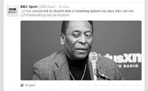 BBC特邀主持人阿兰·希勒问及是否看好巴西夺冠时,贝利答:“当然我必须相信我的祖国球队能进决赛,我相信他们有实力问鼎。锋线攻击力我有些担心,内马尔是伟大球员,我也希望他能复制我的经历赢得冠军。”