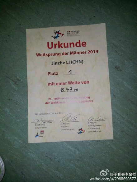 李金哲在微博上亮出自己和成绩显示牌的合影以及成绩单的照片,并对关心他的田径迷们连声道谢:“谢谢你们,我爱你们!”