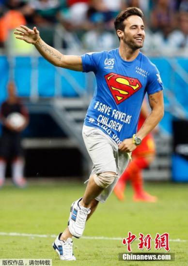 中新网7月2日电 今天凌晨,巴西世界杯1/8决赛迎来收官之战,比利时在萨尔瓦多新水源球场迎来美国队的挑战。不过在比赛刚刚开始后不就,一位身穿超人衣服的“不速之客”就打断了场上比赛。