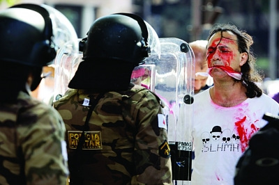 当地时间6月28日,贝洛奥里藏特,世界杯举行使国内物价飞涨,球迷脸上洒满血浆抗议。