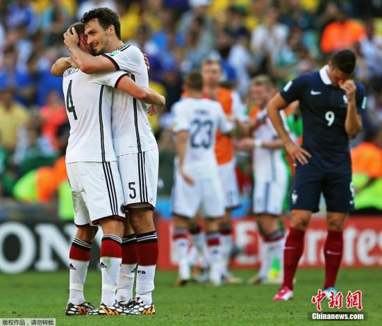 1/4决赛,面对与法国队的强强对话,德国队第12分钟就取得领先,克罗斯开出的任意球帮助胡梅尔斯头球建功。在率先进球后,日耳曼战车以防守为主,本泽马率领的高卢雄鸡未能扳平比分,这场略显沉闷的比赛以德国队1-0小胜收场。日耳曼战车连续四届世界杯闯进四强也创造了世界杯的一项新纪录。