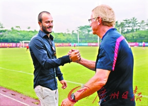 昨天,加盟广州恒大的吉拉迪诺抵达广州,受到球迷的热烈欢迎,之后他来到训练场和主教练里皮见面。